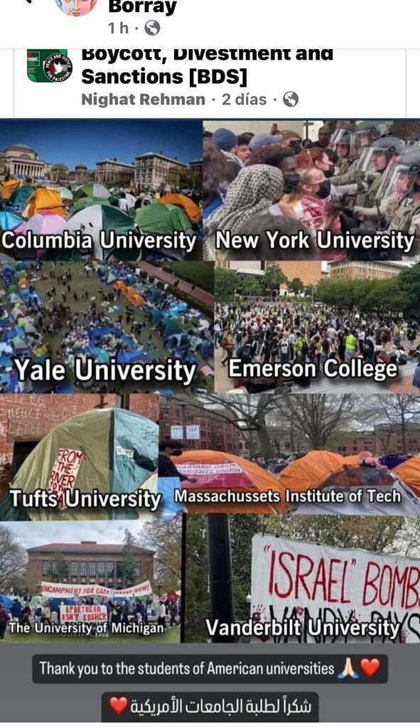 Imágenes de una de las manifestaciones, en la Universidad de Yale: https://www.instagram.com/reel/C6UaZIGvLD7/?igsh=MTc4MmM1YmI2Ng==